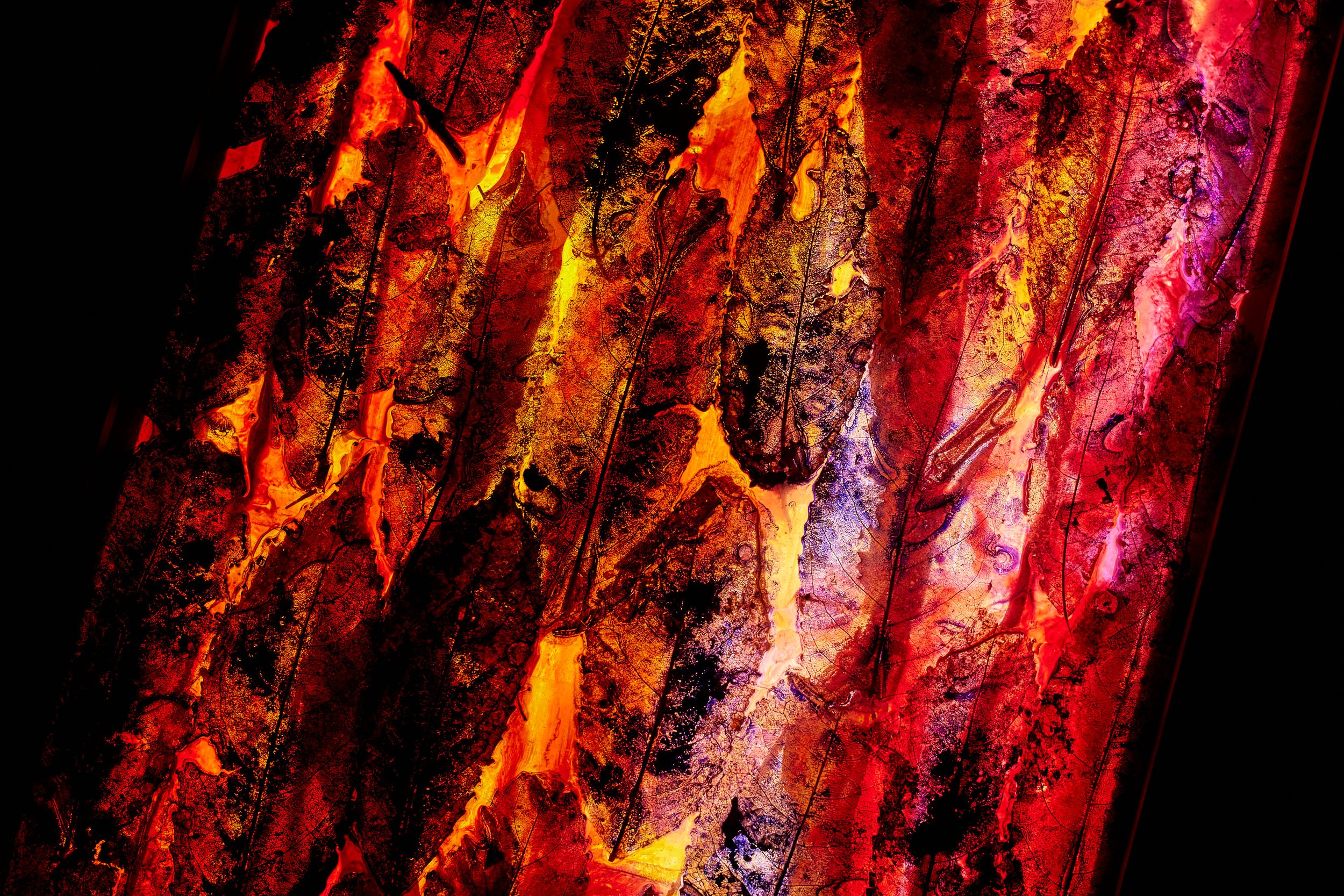 Layers of Māhoe leaves in vivid pinks and purples glow with striking depth, their delicate veins illuminated to reveal the natural patterns within. The Māhoe tree is one of the five sacred fire trees of Māori tradition, remembered in the legend of the fire goddess Mahuika who placed her flame within its branches.